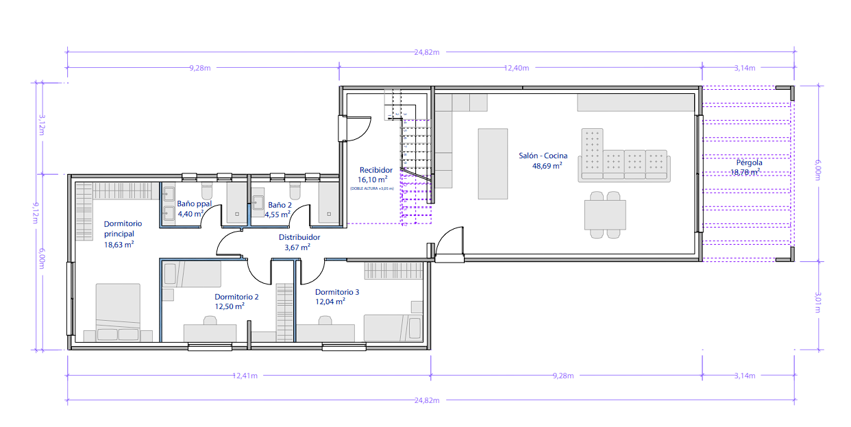 Tiene una superficie de 205m2 construidos de vivienda, pérgola exterior de 18m2 y terrazas por un total de 73,68m2 con los que enamorarás a tu familia y amigos.